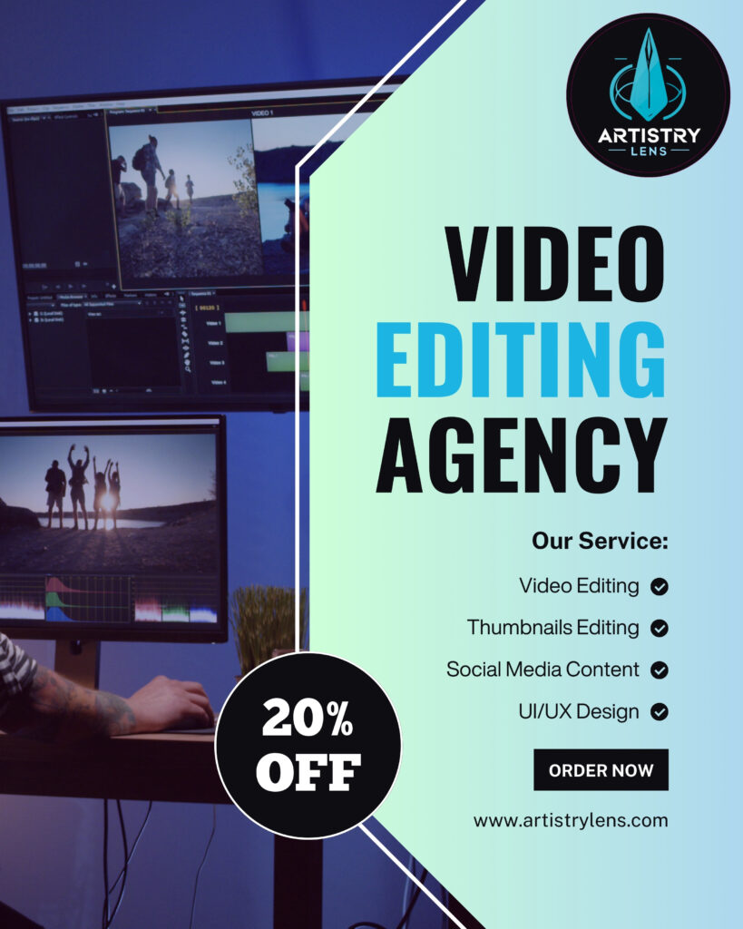 Kickstart your content journey with “Artistry Lens!” For a limited time, get 20% off all our video editing services from long-form edits, shorts, reels and eye catching thumbnails to viral social media content. Whether you’re launching a YouTube channel or scaling your brand, now’s the perfect time to upgrade your visuals without breaking the bank. Let’s create something extraordinary at a fraction of the cost.